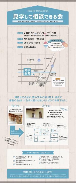 7/27、28の2日間、伊予郡松前町大字昌農内で見学しながらリフォーム・リノベーションについてなんでも聞ける、リノベーション完成見学会を開催致します。構造はそのまま、壁や天井を張り替え、造作で生まれ変わったお住まいを見学しながら中古住宅リフォームの疑問にもお答え致します!建築・住み替え・全面改装・部分改装・中古住宅の探し方のアドバイスや、物件探しもお手伝い致します。お気軽にお越し下さい♪