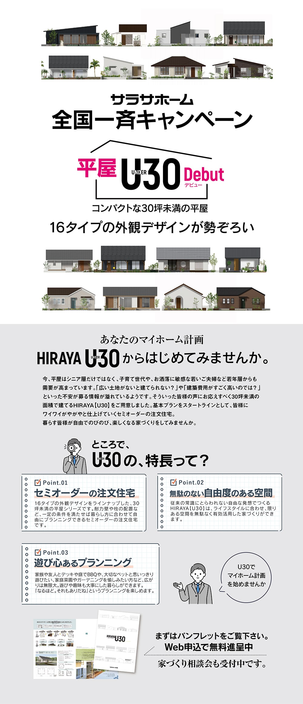 シンプルでミニマムな家もいい。趣味や遊びは全力で愉しみ、外と繋がった庭でのんびり子育てもしたい。 30坪未満の面積で建てるHIRAYA【U30】。こだわりの家づくりをお考えの方、ご興味のある方にパンフレットを無料で差し上げます。家づくり相談会も同時に受付中です。 まずはお気軽にお問い合わせ下さい。