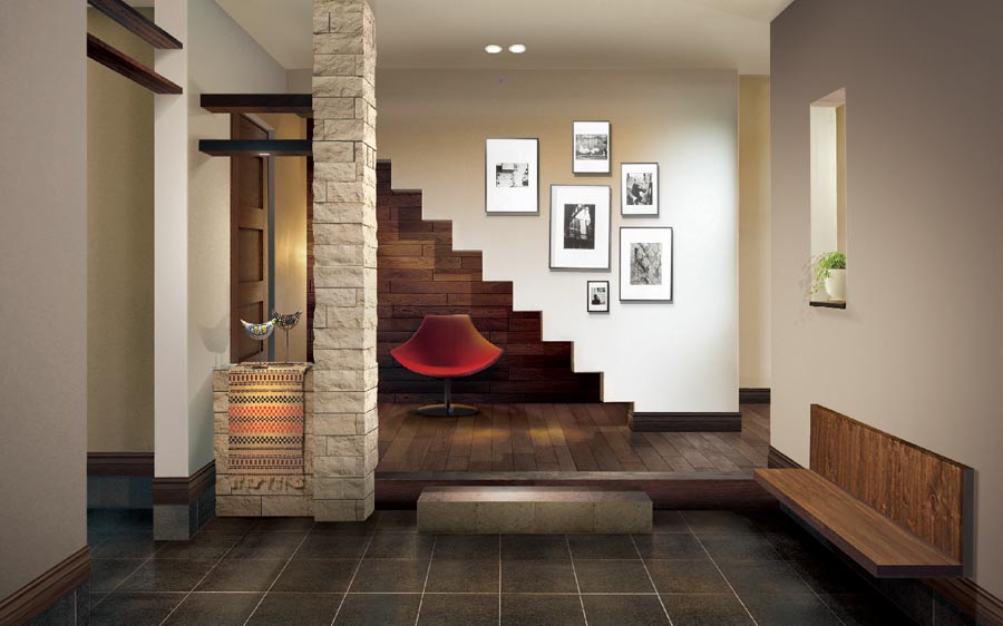 訪れる人を最初にもてなすギャラリーとしてエントランスを遊ぶ。 自慢のコレクションやアート、季節の草花を飾り、家族やお客さまを温かく迎えてくれる我が家のギャラリー空間。